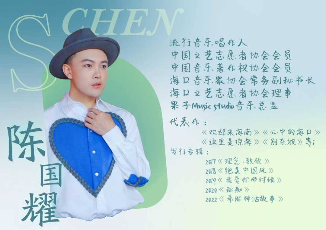 陈国耀,流行音乐唱作人,中国文艺志愿者协会与中国音乐著作权协会成员,海口音乐家协会的常务副秘书长,用一首首脍炙人口的作品,如《欢迎来海南》、《心中的海口》等,搭建起连接海南与世界的心灵桥梁。他的音乐,是对这片土地最深情的告白,是对海南文化最真挚的传承。