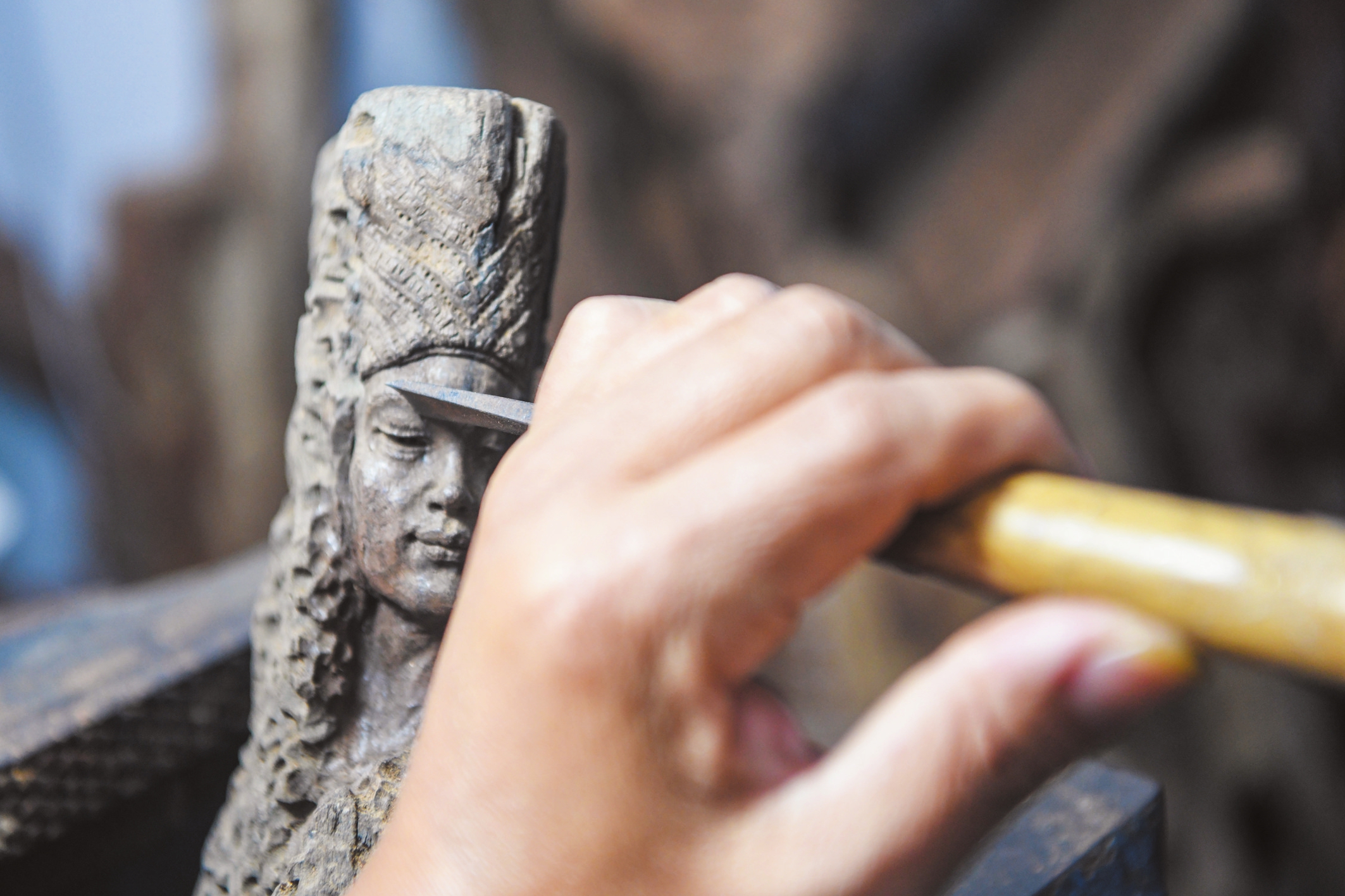 “非遗”传承人黄黎祥正在进行木雕创作。