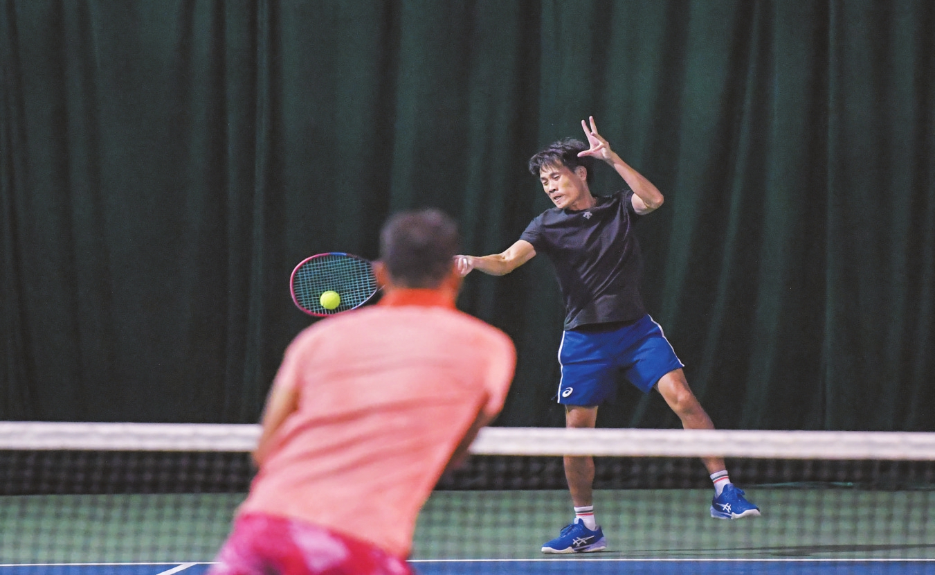 11月24日,在中国业余网球公开赛(CTA—Open)(海南站)暨2024年“中国体育彩票”杯海南省第25届网球公开赛现场,选手正在进行新锐组男双决赛。本报记者 孙士杰 摄