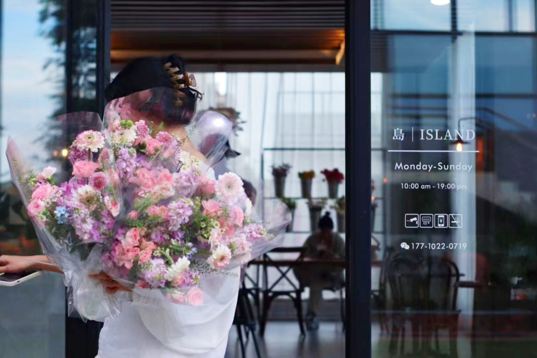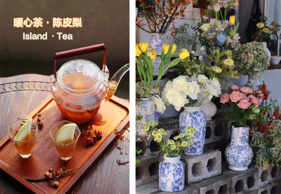 店里到处都是鲜花,随手一拍好出片啊。下午茶匠心制作的甜品让人垂涎,绵密口感的巧克力布朗尼,搭配一杯清爽的话梅气泡美式,迸发出令人惊喜的缤纷口感,还可以散步至海边,看看日落。