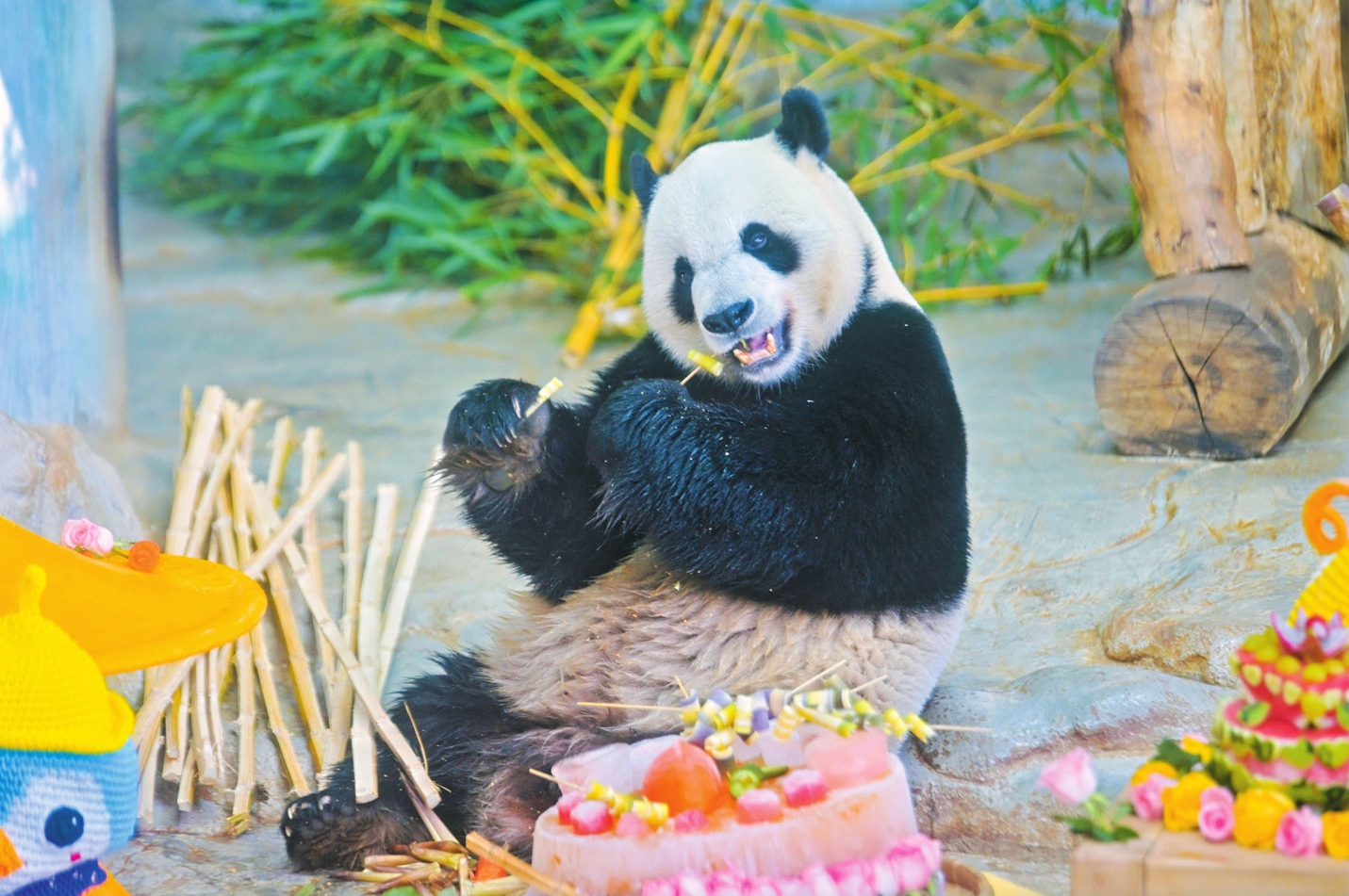 11月30日,海南热带野生动植物园为熊猫兄弟准备了登岛6周年大餐。 本报记者 石中华 通讯员 杨儒弢 摄