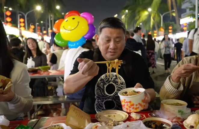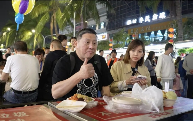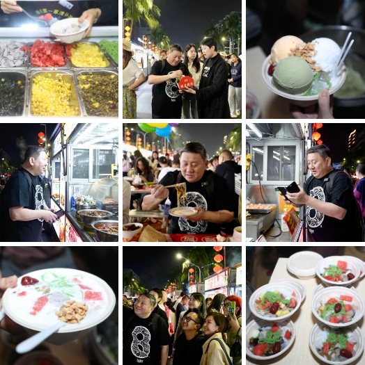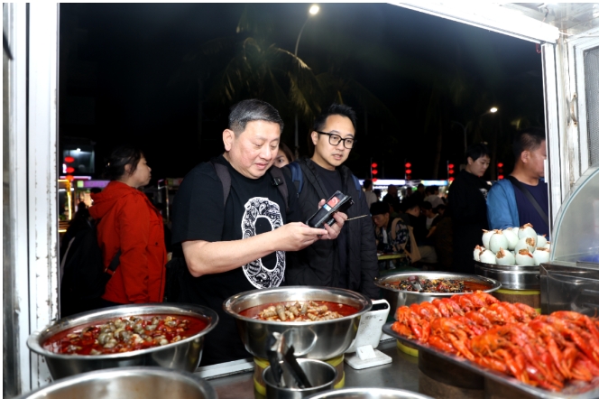 和海南一样,新加坡同样有着热气腾腾的夜市文化,从华人节日市集到现代音乐、时装展览,夜市主题和活动丰富多样。陈海泉大使旧时在新加坡便常去夜市,来到烟火气满满的海大南门夜市,大使不禁夸下“海口”:“今晚吃得太棒了,这个夜市是我来中国之后最好的体验之一,希望还能再回来这个夜市。”