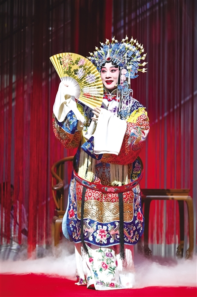 京剧《贵妃醉酒》中杨贵妃的华服,以其绚丽的色彩和精致的刺绣,展现了唐朝的繁荣与奢华;汉剧《宇宙锋》和《哭祖庙》中的服饰,以其独特的风格和考究的工艺,彰显了汉剧的庄重与深沉。昆曲《牡丹亭》的服饰则如同它的曲调一般,细腻而柔美,让人仿佛置身于江南水乡的烟雨之中;粤剧《花好月圆》展现了南国风情的热烈与欢快;琼剧《百花公主》和《张文秀》则以其鲜明的地方特色,让人感受到海南岛的风土人情……每一套服饰不仅是角色的外在装扮,也是地域文化和艺术的体现。
