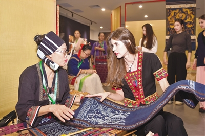 展区内,还有黎族传统纺染织绣技艺、钉金绣裙褂制作工艺、白族扎染技艺等代表性传承人现场展示织染绣作品的制作过程,令观众直观地领略非遗项目的丰富多样与精彩纷呈,了解不同地方的地域特色与文化特征,进一步增强对非遗保护与传承的意识。