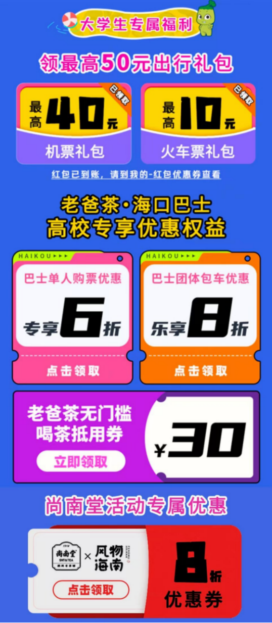 为了让更多武汉学子们享受海口的美食和美景,海口市旅游文体局特别推出了多项线上优惠措施一直持续至2025年1月底。在同程旅行APP及微信小程序开设了海口旅游专题馆,输入“海口”即可“解锁”高校学生专属优惠福利,一键预定“海口真好玩”特色旅游产品。同时还可以领取海口老爸茶和尚南堂等特色品牌商家的最低6折优惠福利以及最高50元专属出行礼包,涵盖了吃住行游购娱各个方面。