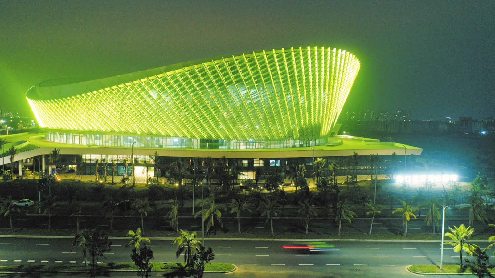12月27日,海口五源河体育馆灯火辉煌,景色迷人。