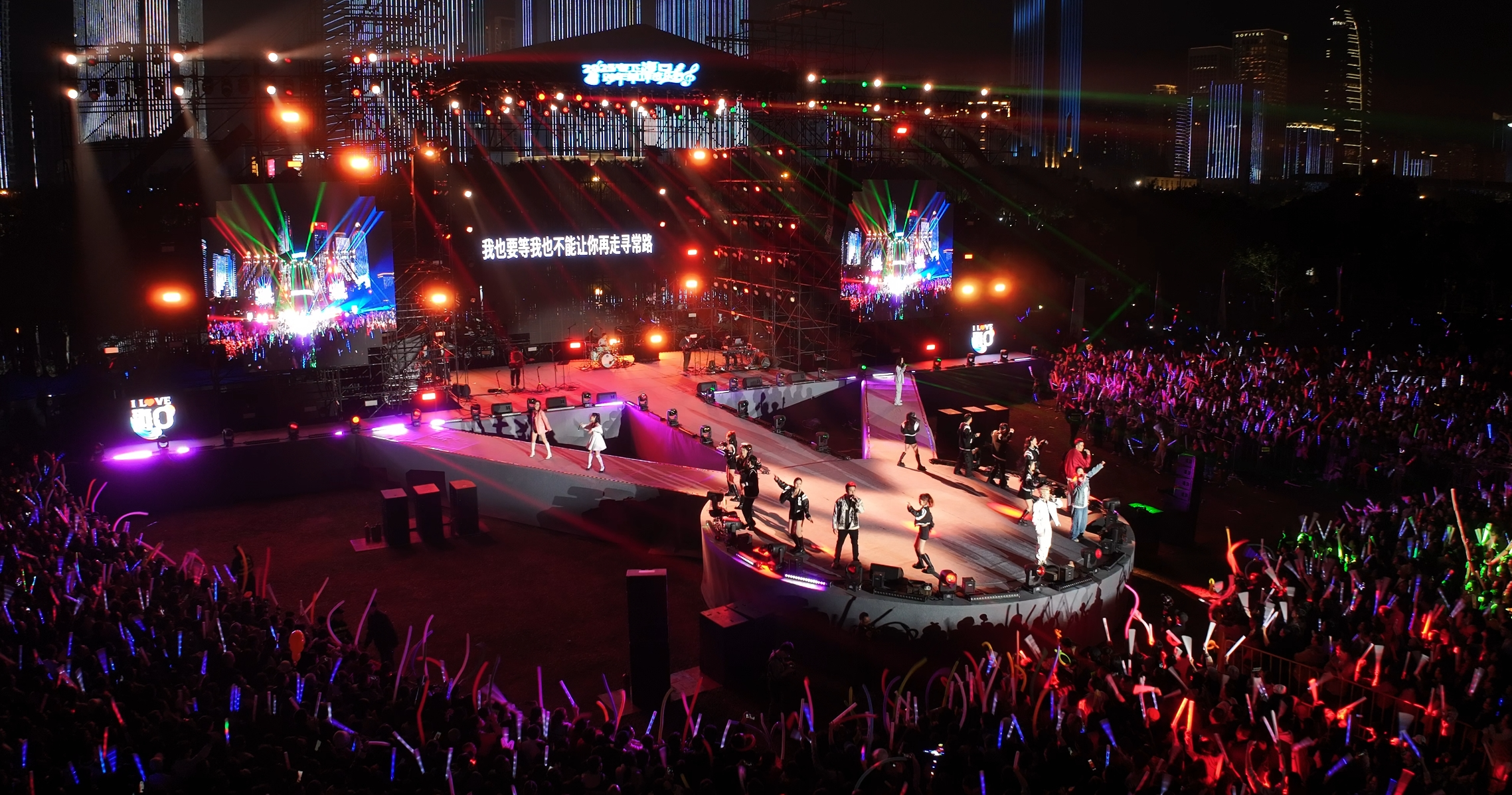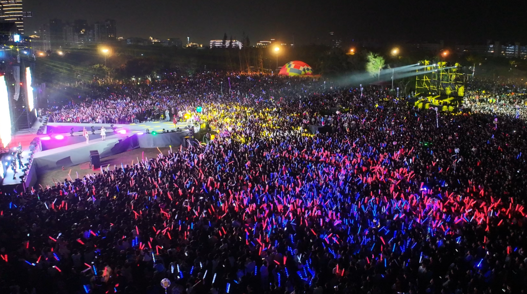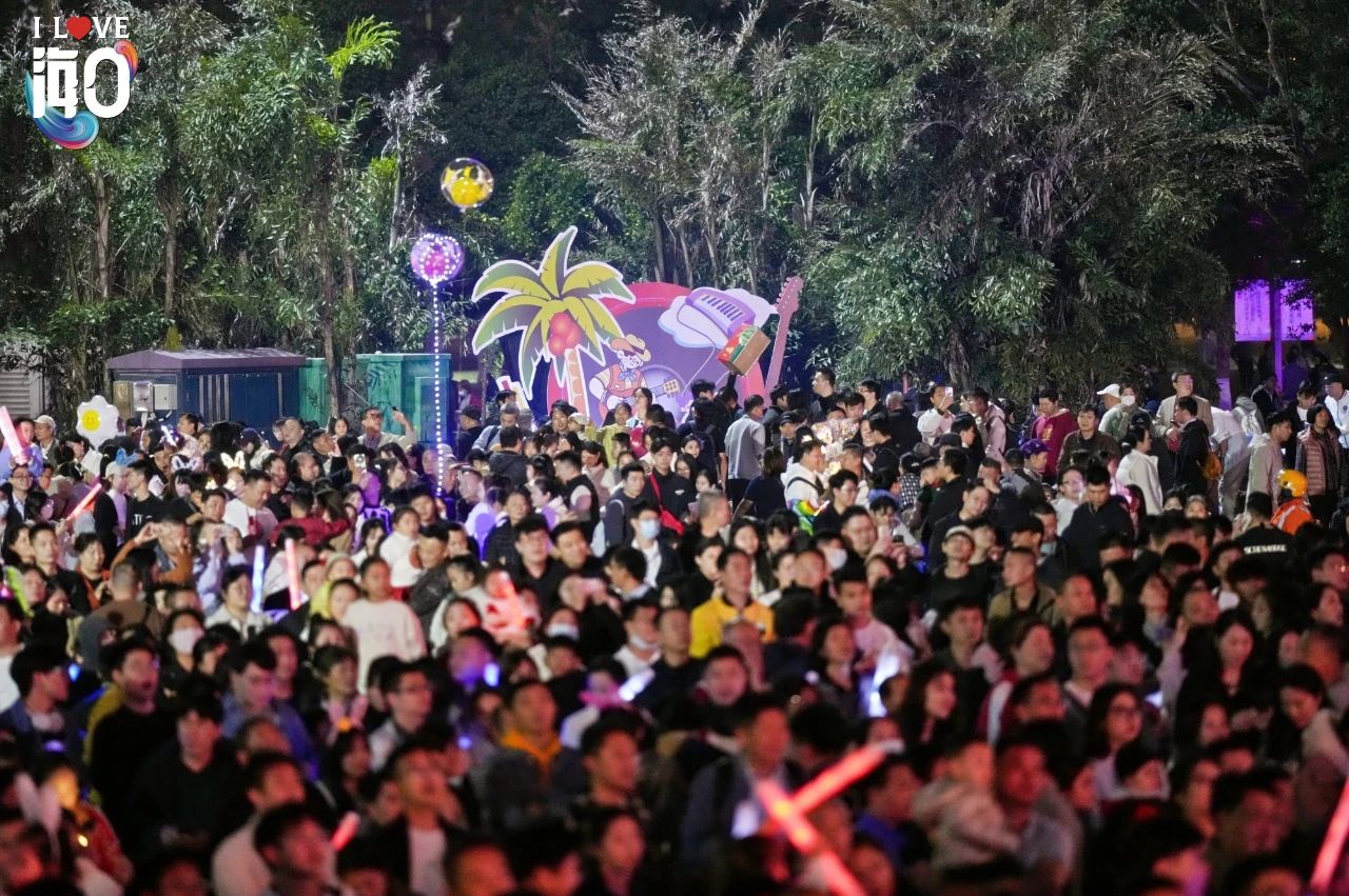 晚19:00,万绿园草坪上,一条“时光隧道”悄然开启。《沧海一声笑》《有多少爱可以重来》《双节棍》《青春修炼手册》《奢香夫人》《APT》……一首首经典歌曲携带不同年代的“海口记忆”,一路从1970穿梭至2025,观众们挥舞着手中的荧光棒,尽情放声跟唱,跟随着音乐律动摇摆身体,共享音乐狂欢。