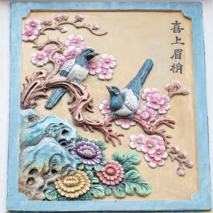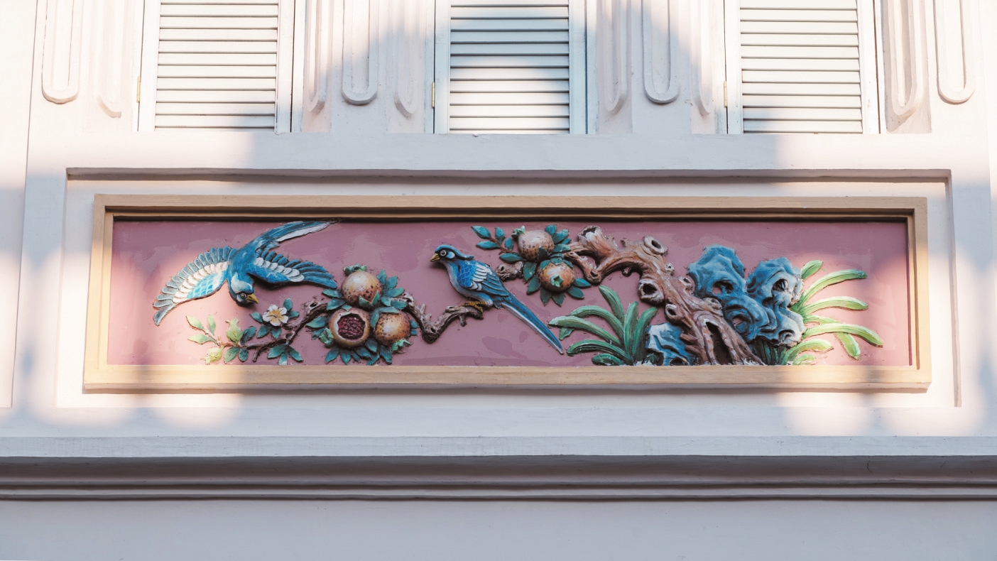 海口博爱路骑楼墙面灰塑栩栩如生。