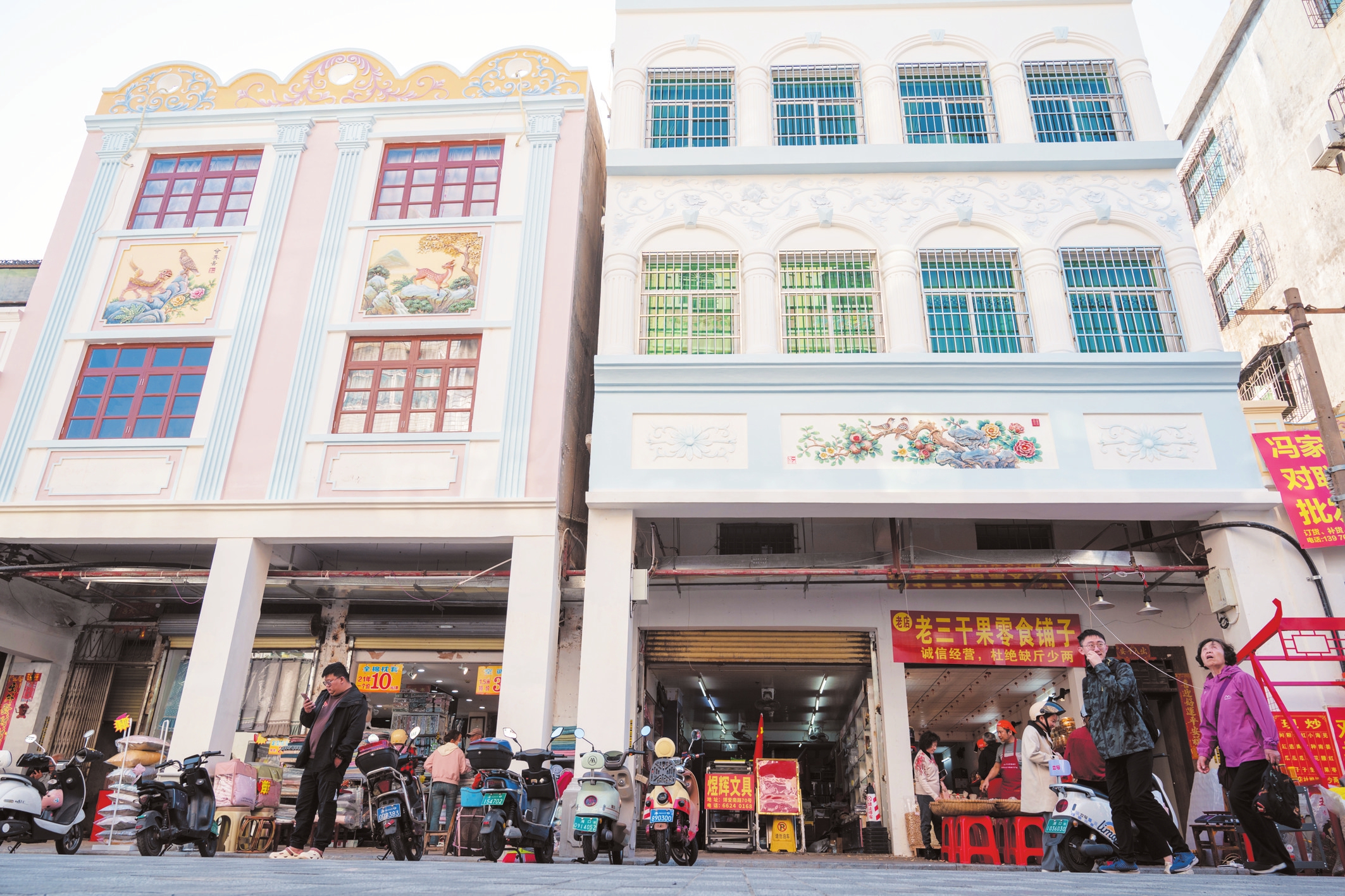 近日,海口骑楼历史文化街区博爱路修缮后街景焕然一新,以往老旧的骑楼墙面融入大量灰塑工艺,恢复原有的历史风貌,在保留传统韵味的同时又富有时代气息。