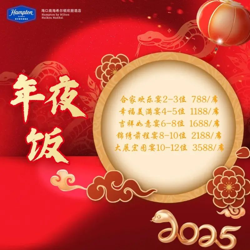 金蛇迎春,阖家团圆。海南迎宾馆推出万事如意宴9888元/席(16位用)、合家欢乐宴6888元/席(10位用)、吉祥如意宴4888元/席(10位用)、2025年全日制春节套餐498元(2位用);888元(4位用);1388元(6位用)。