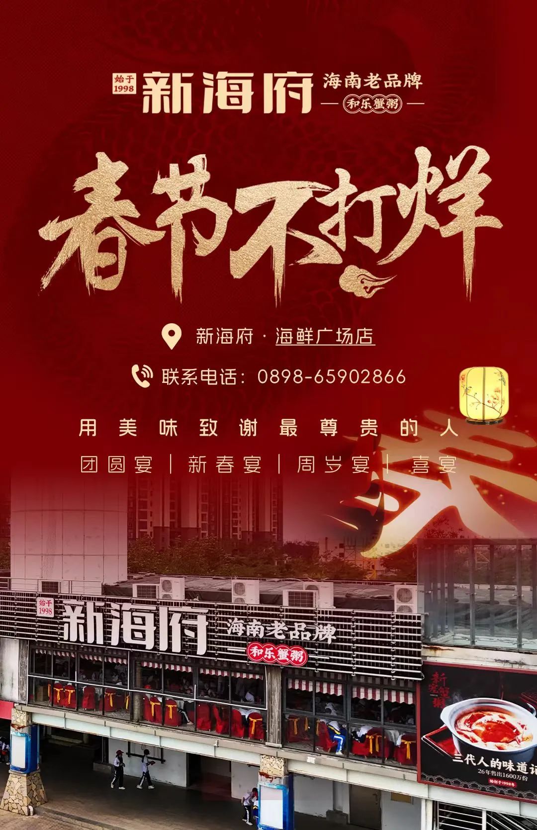灵蛇迎春,聚飨年味。新海府和乐蟹粥推出瑞蛇呈祥四季平安宴799元/桌、灵蛇祈福阖家欢聚宴1899元/桌、蛇年丰登年年有余宴2399元/桌。