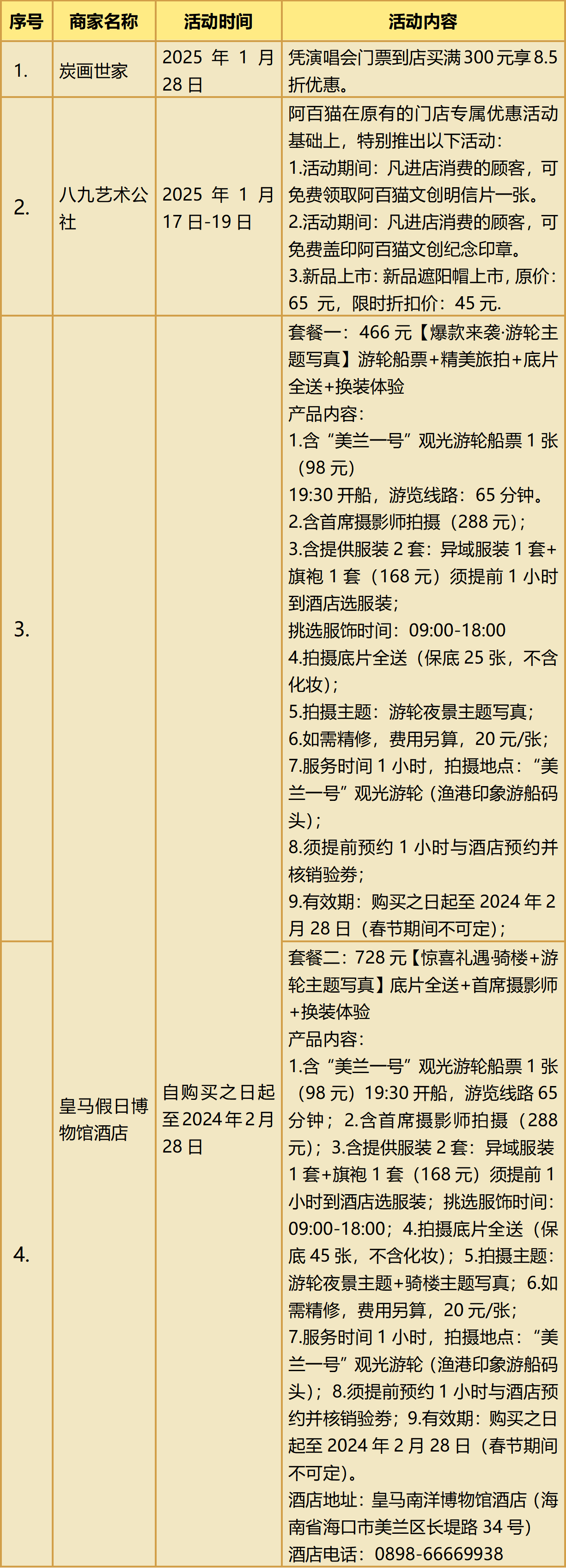 6、餐饮权益:凭演唱会门票或工作证到店用餐享专属优惠折扣低至7折。(部分商户不参与,实际以cdf海口国际免税城餐饮店具体折扣为准。