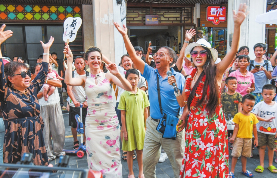 在海口骑楼老街,街头艺人演唱吸引众多市民游客参与互动,热闹非凡。 本报记者 康登淋 摄