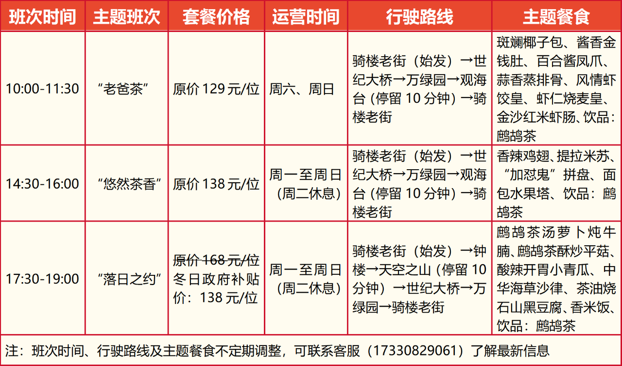 发车时间:请于发车时间,提前15分钟到达上车地点等候上车(全程约90分钟,具体视当天交通状况而定)。