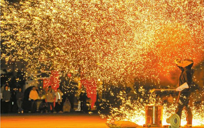 海口观澜湖电影公社内上演“非遗”铁花秀,现场洋溢着浓浓的年味。本报记者 康登淋 摄
