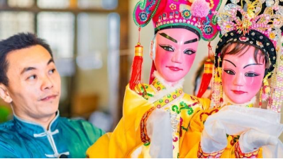 2.公仔戏互动体验:市民与公仔戏主角合影留念,公仔戏老师指导体验公仔木偶操作戏表演。