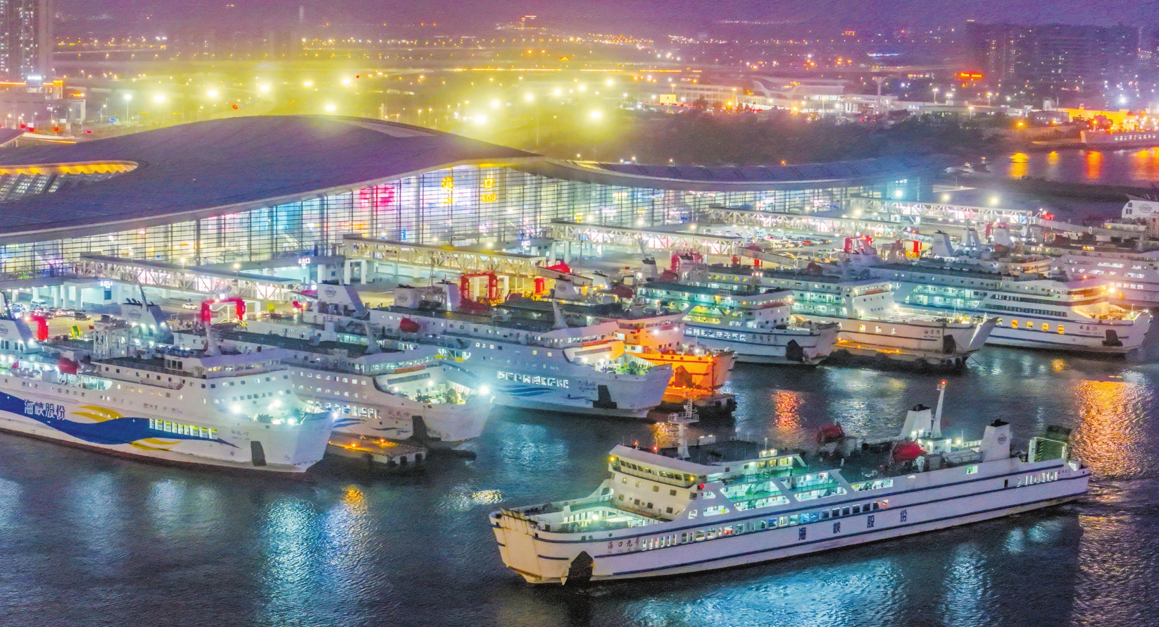 1月30日,夜幕降临,海口新海港码头灯火通明,船只往来穿梭,呈现出一派繁忙景象。本报记者 康登淋 摄