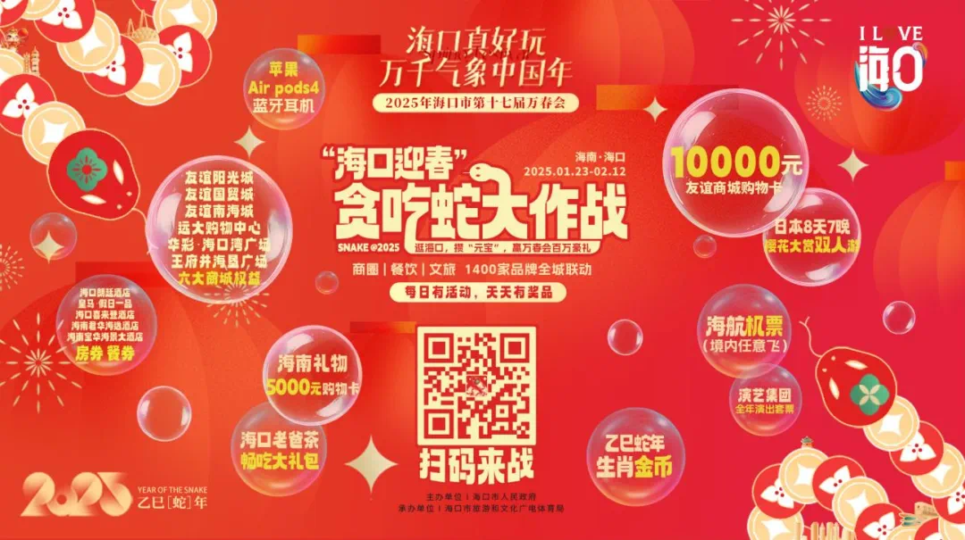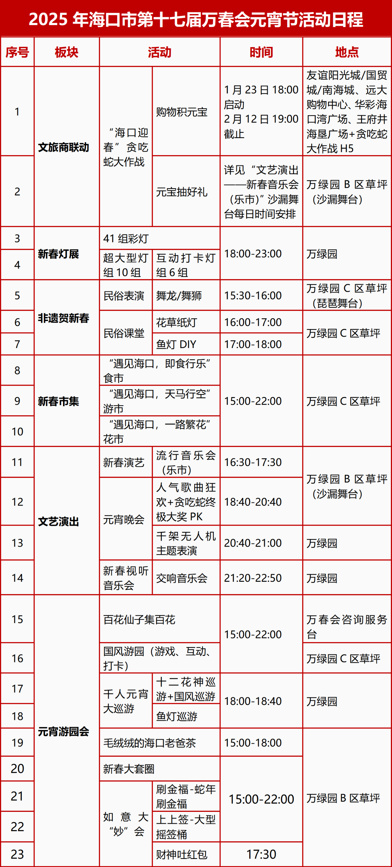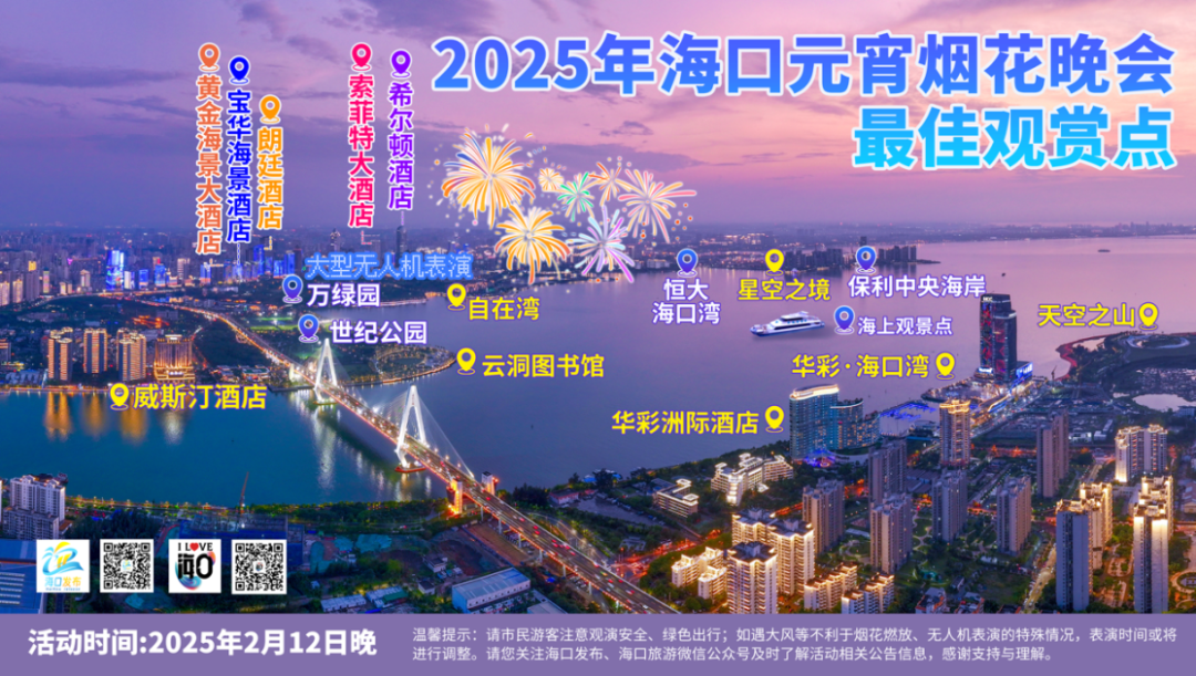 时间:2025年2月12日20:40-21:20(其中20:40-21:00在万绿园举办大型无人机表演,21:00-21:20在海口湾举办I级烟花表演)