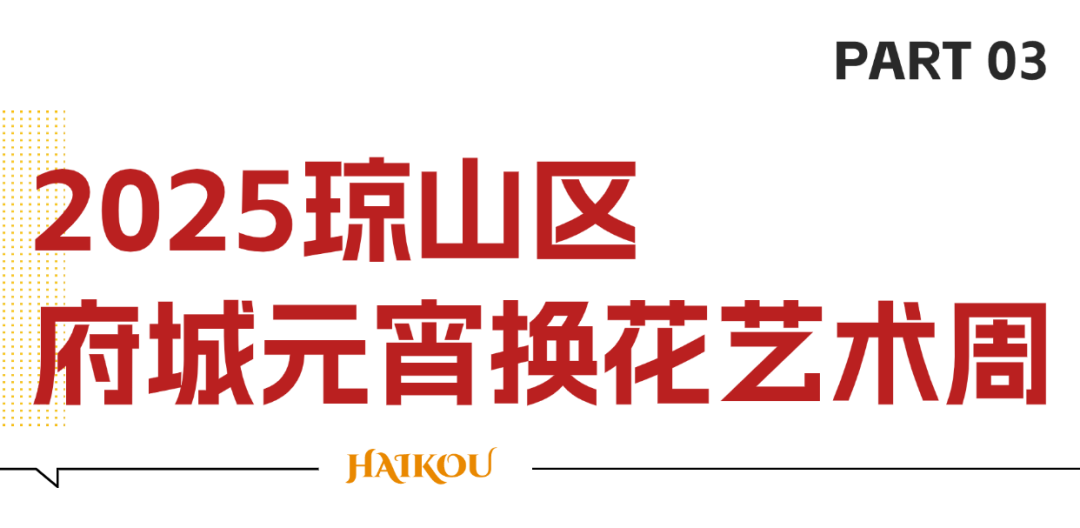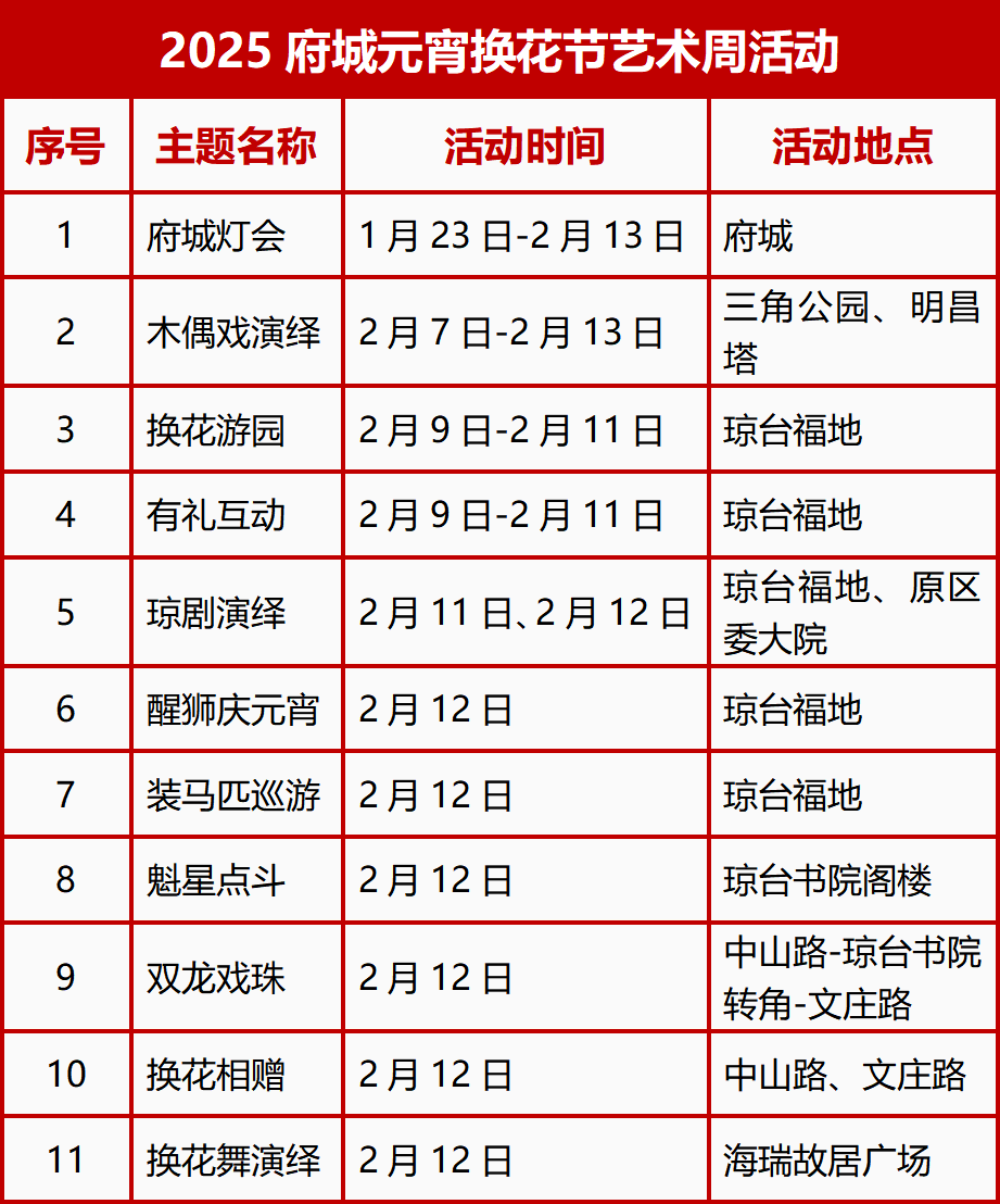 本次活动以“千年府城,换花相会”为主题,在保留传统舞狮、琼剧、换花舞等传统民俗活动的基础上,还新增了双龙戏珠、换花舞演绎、木偶戏演绎、游园雅趣、福字拓印、折青礼等一系列活动,快带着家人朋友,一起走进府城,换花送福浪漫相会、赏花灯美景映照人间、品非遗民俗传承千年,共度一个难忘的府城元宵换花节艺术周吧。