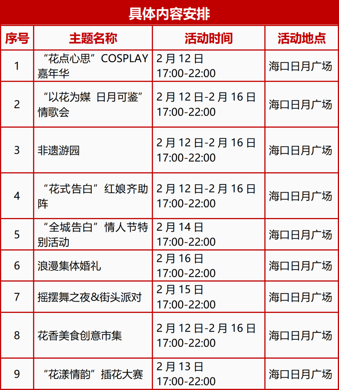 现场将开展“花点心思”COSPLAY嘉年华、“全城告白”情人节特别活动、浪漫集体婚礼、“以花为媒 日月可鉴”情歌会、非遗游园、“花式告白” 红娘齐助阵、“花漾情韵”插花大赛、摇摆舞之夜&街头派对、花香美食创意市集等特色活动,为市民游客打造一场精彩纷呈的感官盛宴。