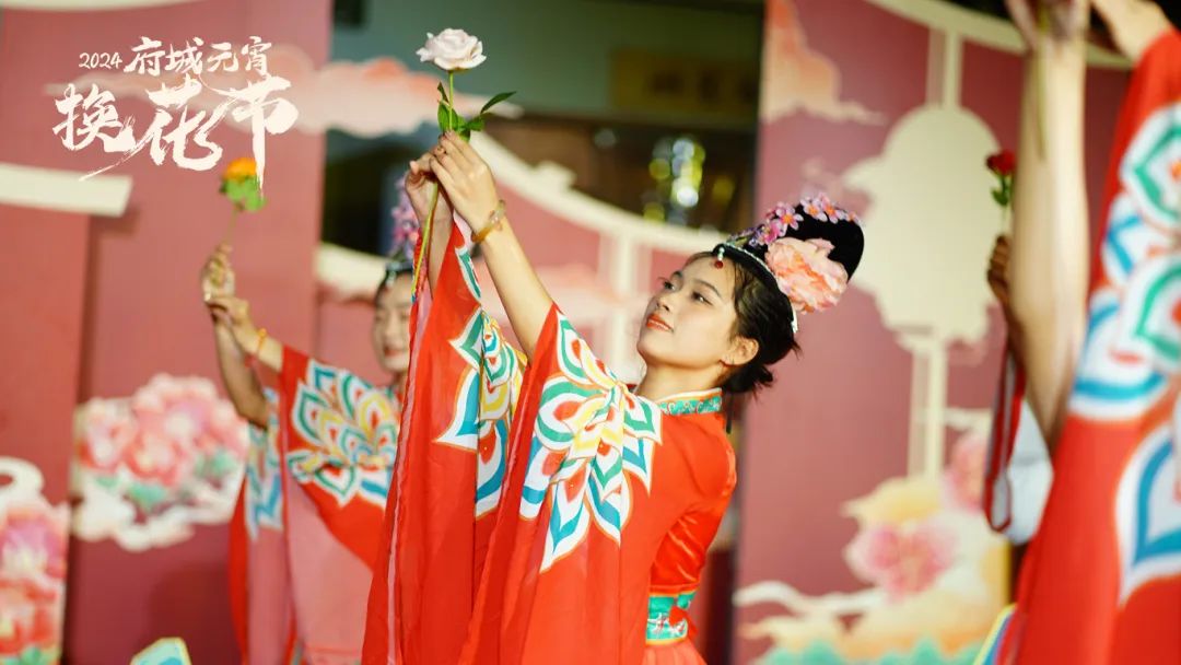 换花是府城人元宵闹春的主要民俗活动。在元宵节当天晚上,六组身着飘逸古装的桃花郎与桃花仙,将穿梭在人流之中,与市民游客热情互动,送上新年的祝福。同时,身着国风服饰的市民游客,还将收获由桃花郎或桃花仙亲手递上的娇艳玫瑰花一朵。