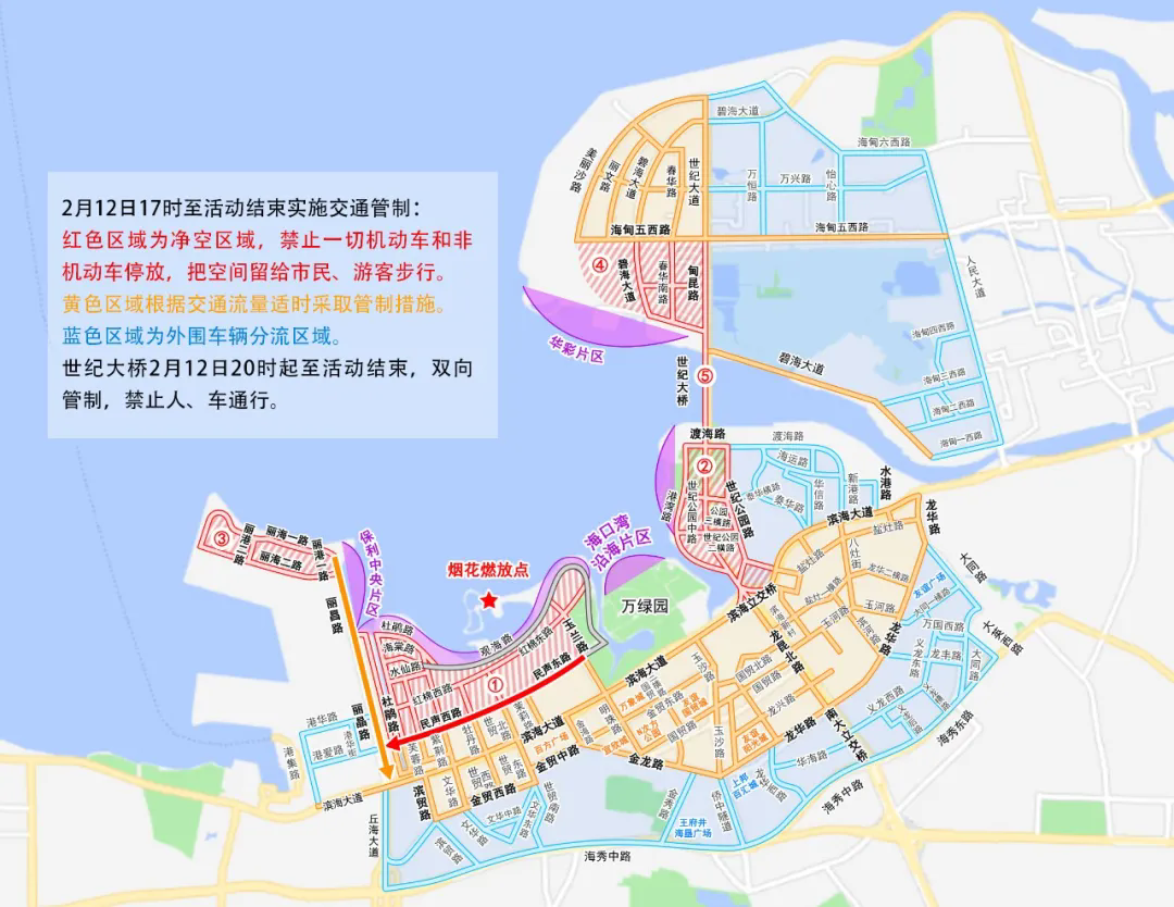 5.世纪大桥2月12日20时起至活动结束,双向管制,禁止人、车通行。