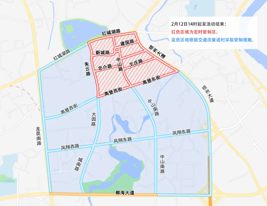 7.府城换花节活动现场2月12日14时起至活动结束,对朱云路以东(不含朱云路),红城湖路以南(不含红城湖路),琼州大道以西(不含琼州大道),高登东、西街以北(不含高登东、西街)所组成的封闭区域实施交通管制。