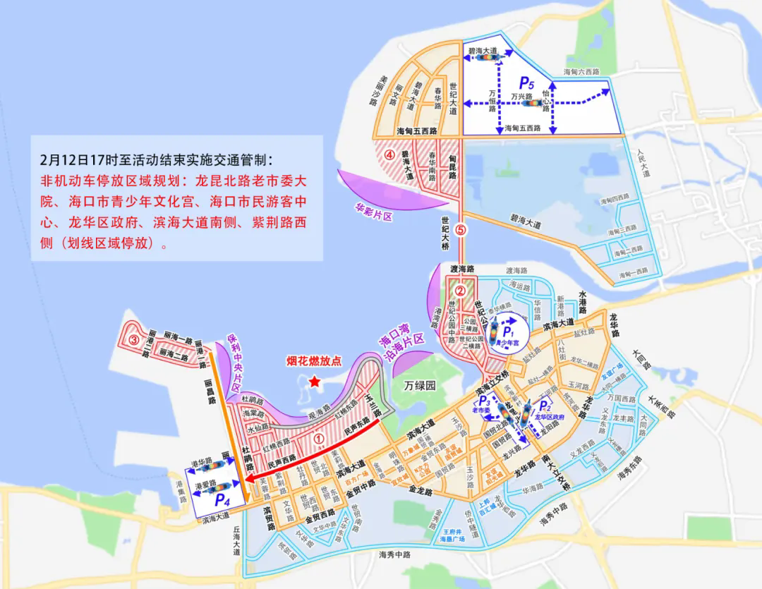 2025年2月12日(星期三)是中国传统节日元宵节。元宵节当天我市将举行烟花晚会(21:00至21:20在海口美源游艇码头燃放)、无人机表演(20:40—21:00在万绿园飞行)、换花节(全天在琼山区府城城区)及文艺表演等系列活动,大量市民及游客将自发前往观看,预计参加活动人数有50万人。为确保活动现场周边道路顺畅、安全,海口公安交警将对部分道路实施交通管制,进行人车分离,现将出行方式提醒如下:
