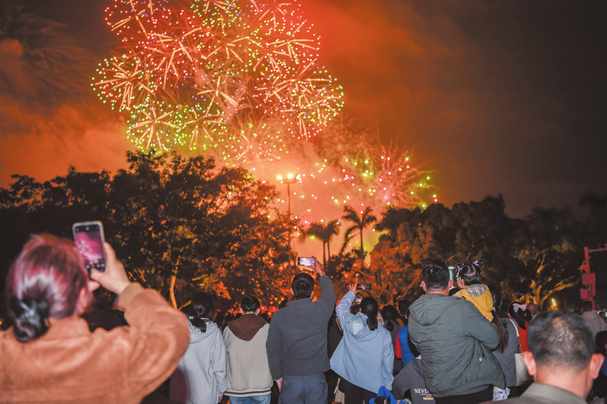 2月12日,在海口万绿园,烟花表演吸引市民游客驻足观看。本报记者 孙士杰 摄