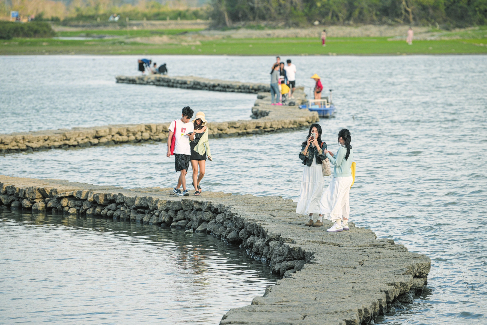 国仓村石桥位于海口市琼山区龙塘镇美味河畔,是明代名臣丘濬带领当地乡绅民众修建的系列水利工程中的一部分,距今已有500余年历史。其因形似长蛇伏卧河面,又被称为“蛇桥”。石桥由火山石修建,水涨则没,水退则显,一年只在初春至初夏时节浮出水面。近期,石桥再次显现,吸引了不少游客前来踏青观景,感受当地人文历史。新华社记者 蒲晓旭 摄