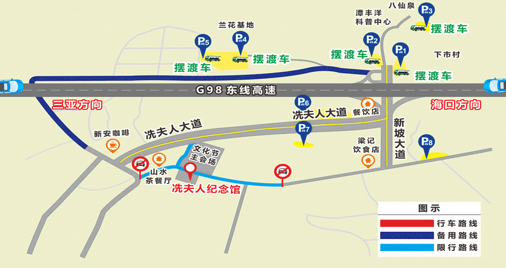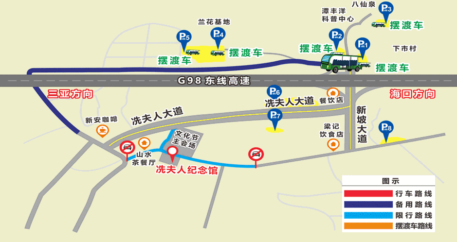 摆渡车路线:兰花基地路--博文涵洞--冼夫人大道--新坡大道--回到摆渡点(备注:摆渡车招手即停即上)