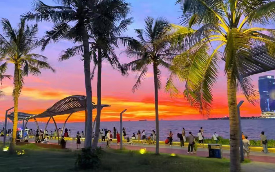 骑在椰风海韵、绿意盎然的海口湾绿道上,尽情享受着这座热带滨海城市的浪漫与惬意。如果你恰巧在日落时分,骑到云洞图书馆,吹一吹海风,看一场绝美的日落,“远方”的美好就在眼前。不妨停下来拍一张照吧!这一瞬的美,是不需要加滤镜的。