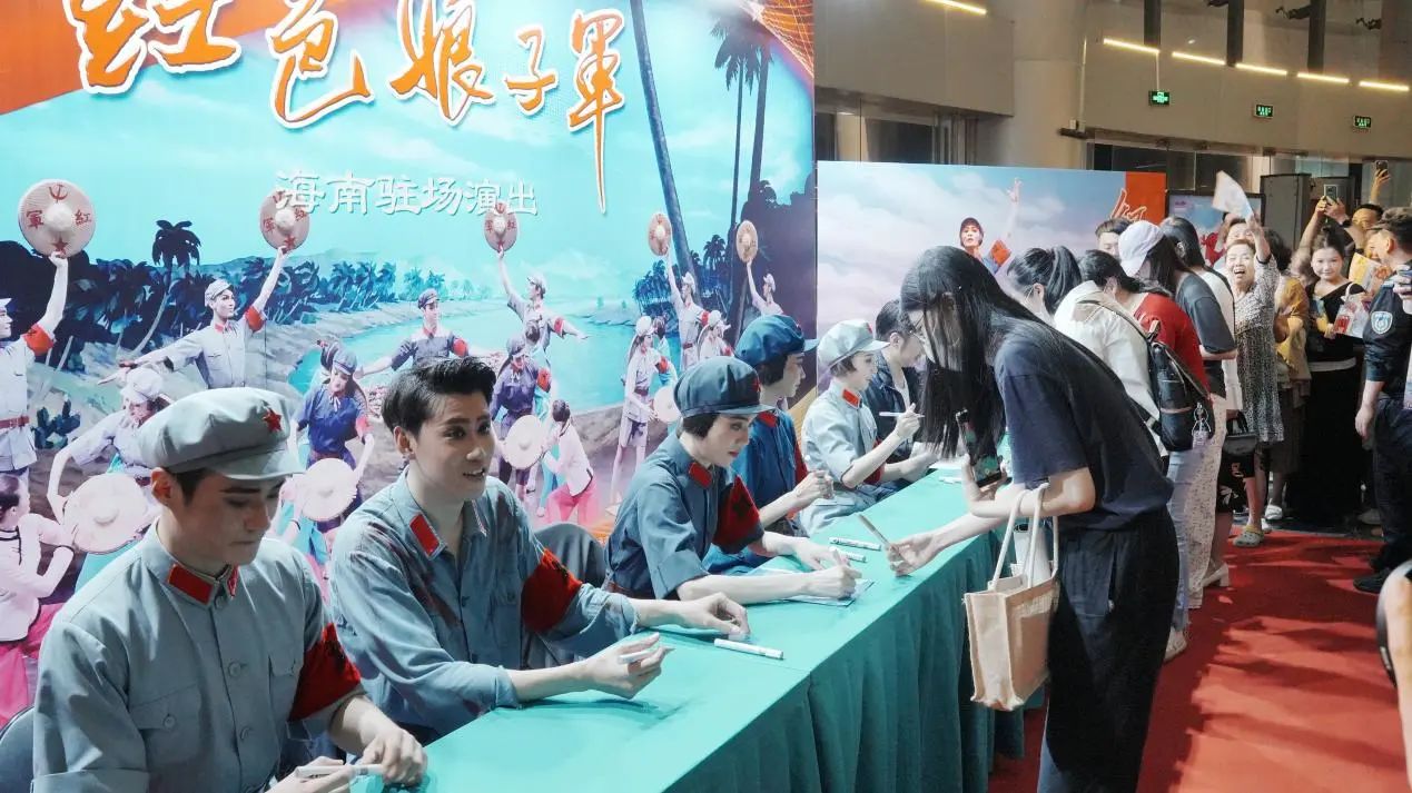 演出结束后,舞剧中的七大主演——琼花的扮演者张浥洙、洪常青的扮演者武思明以及“连长”靖心宇、“南霸天”吴子恒、“老四”刘凯、“小娥”刘煜辰、“小庞”卢陈奇等现场签名,与海南观众热情互动,气氛热烈而温馨。