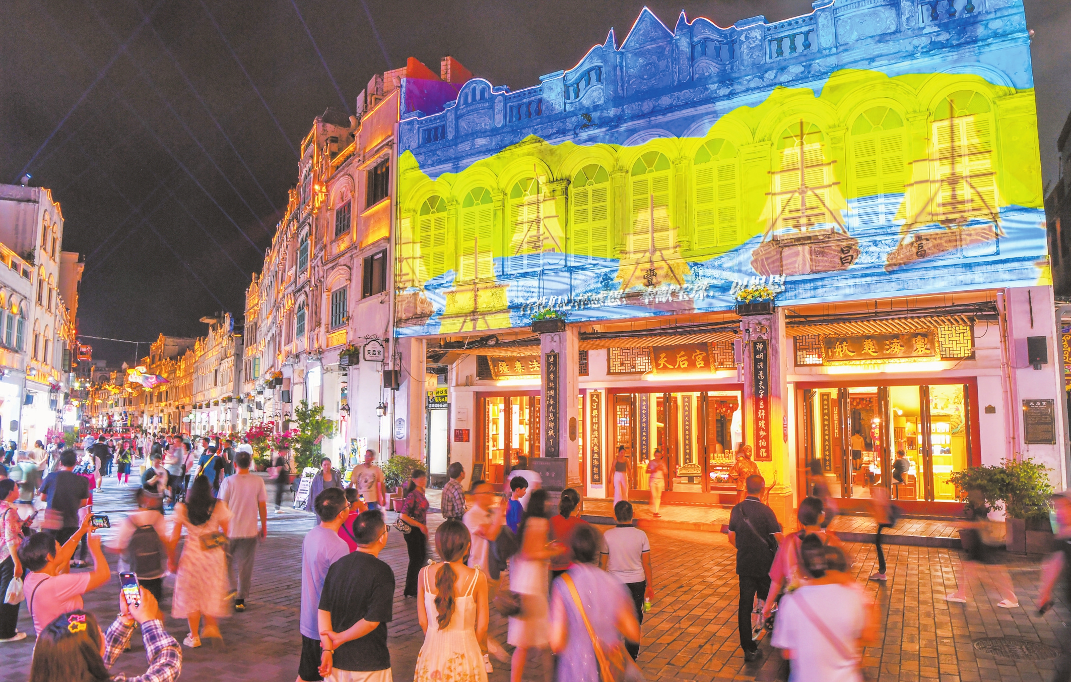 3月28日,海口骑楼老街天后宫通过光影技术生动展现海洋文化与妈祖文化内涵。 本报记者 康登淋 摄
