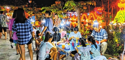 在海口丘浚文化公园门口处,21岁的许有旭选择在此经营手打柠檬茶,许有旭笑着说:“因为公园附近人流量大,烟火气重,卖东西的话会比较好卖一些,所以选择在这里创业。我一般每天能卖50到60杯,带来的货几乎都能卖掉。”在公园夜市,像许有旭这样的年轻人不在少数,对于像许有旭这样希望以较低门槛试水创业的年轻人来说,公园无疑提供了一个理想的平台,市民在享受公园休闲娱乐活动的同时,往往也会成为小贩们的消费群体,从而带动区域经济循环发展。
