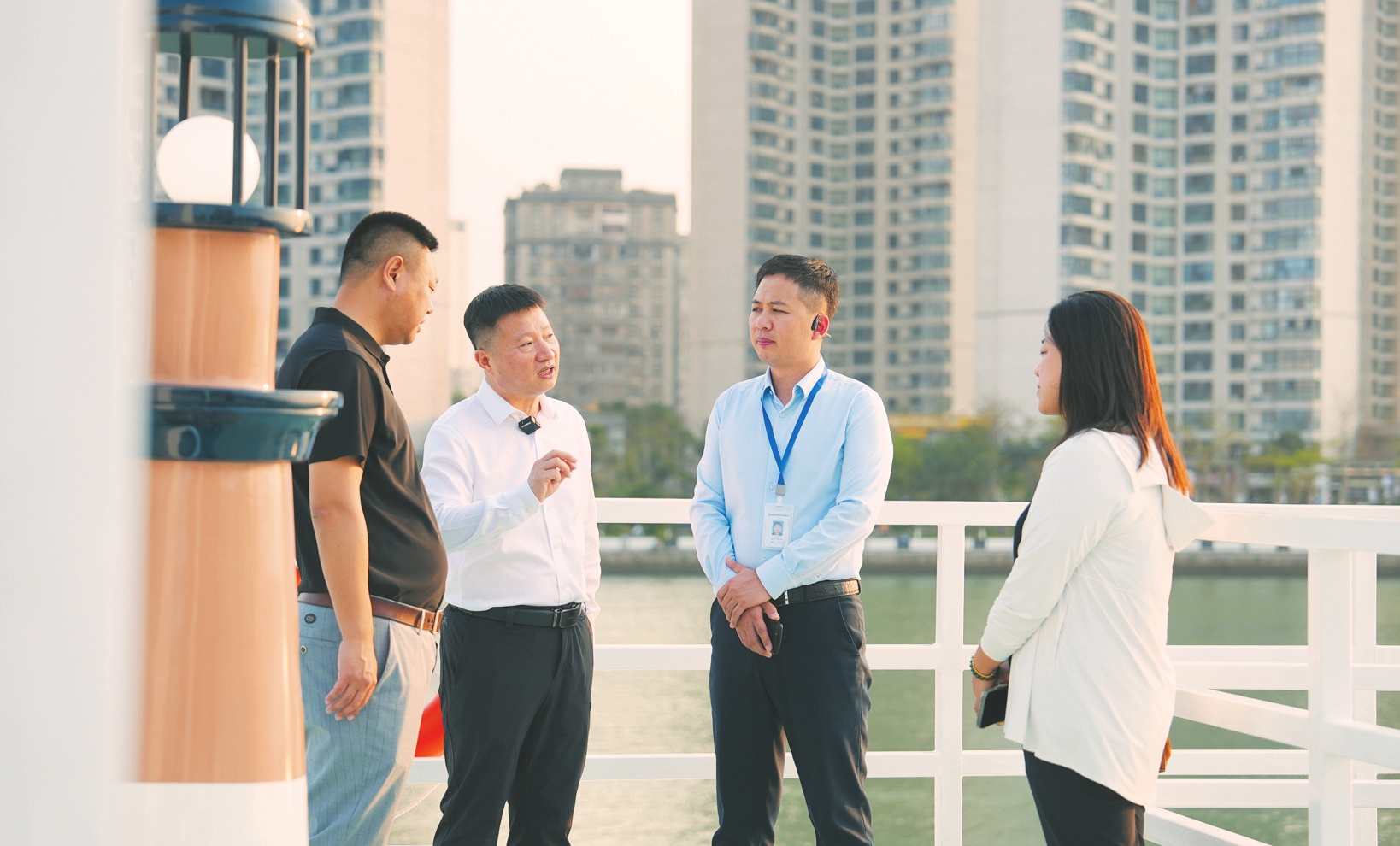在“海旅01”游船上,鬲永奇(左二)与同事们沟通交流。本报记者 杨忠凯 摄