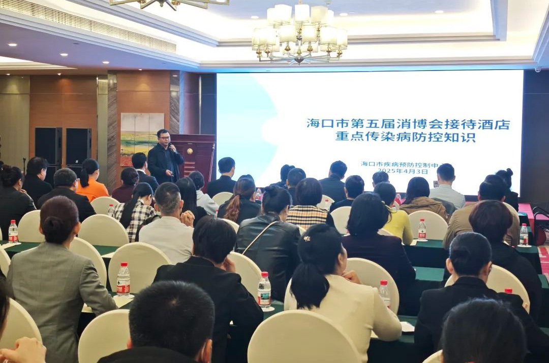 海口市疾控中心传染病预防控制科科长王明昌讲授重大活动接待酒店重点传染病防控知识,为活动期间人员健康安全保驾护航。