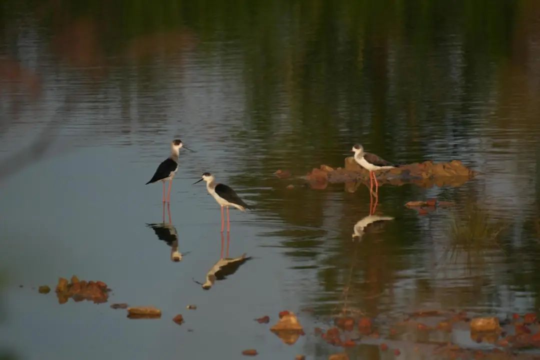 成群的黑翅长脚鹬在海南东寨港国家级自然保护区下塘湿地栖息。