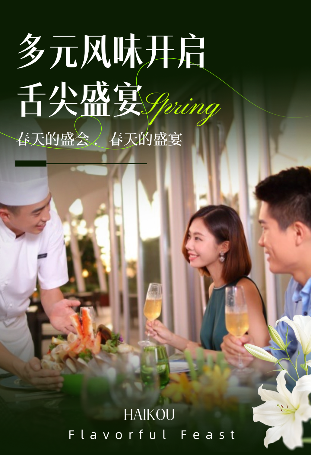 田园汇西餐厅季节限定生蚝自助,以鲜活食材搭开启舌尖上的海岛巡游,限定优惠,158元/位;华味轩中餐厅主厨团队严选马鲛鱼、文昌鸡获等食材,匠心呈现香茅酱定安黑猪排胃配百香果、糟粕醋海鲜锅和雷公笋焖加积鸭时令美馔。配以中式茶酒美学,在雅致园林景致中演绎舌尖的岭南风情。