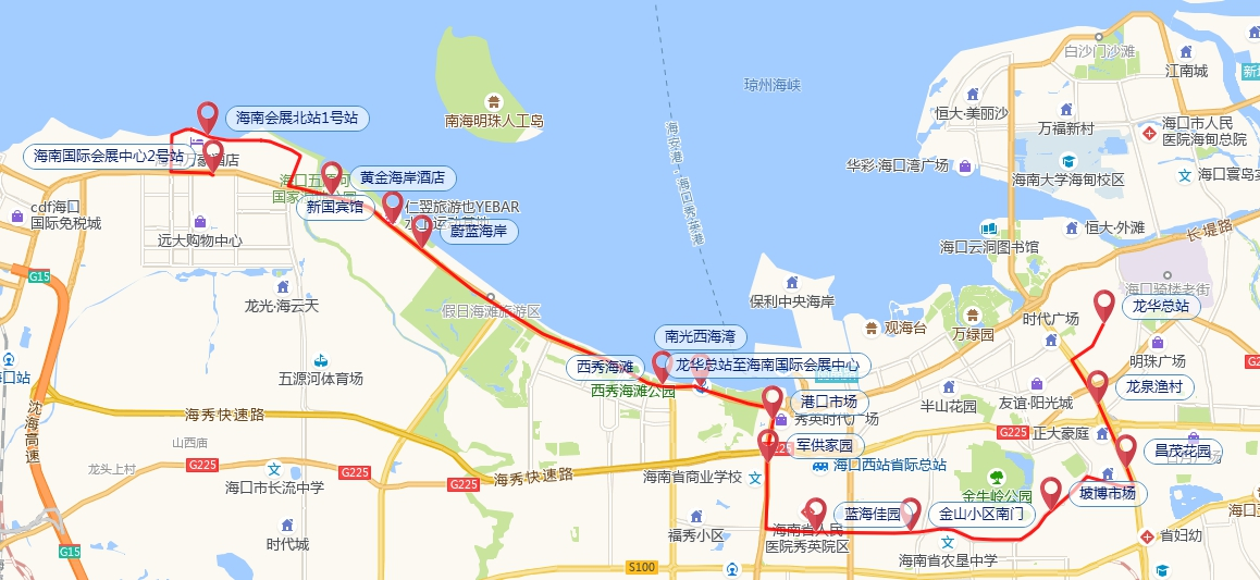 1、经停站点。往程,龙华总站、龙泉渔村、昌茂花园2号站、坡博市场、金山小区南门、蓝海佳园、军供家园、港口市场、南光西海湾、西秀海滩、蔚蓝海岸、新国宾馆、黄金海岸酒店、海南会展北站1号站;返程,海南国际会展中心2号站(最外侧通道)、黄金海岸酒店、新国宾馆、蔚蓝海岸、西秀海滩、南光西海湾、港口市场、军供家园、蓝海佳园、海口供电公司、坡博市场、昌茂花园、白坡里、龙华总站。
