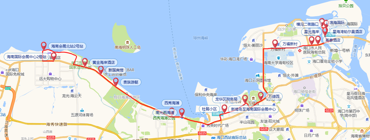 1、经停站点。往程,水上海岸派出所、半岛蓝湾、丽海云霞、万绿园、海口湾演艺中心南门、海口中学、君华海逸酒店、秀英港、南光西海湾、西秀海滩、假日海滩、贵族游艇、新国宾馆、黄金海岸酒店、海南会展北站1号站;返程,海南国际会展中心2号站(最外侧通道)、浪琴湾、黄金海岸酒店、新国宾馆、贵族游艇、假日海滩、西秀海滩、南光西海湾、秀英港、君华海逸酒店、海航国际广场、海口湾演艺中心南门、万绿园、美丽沙花园、半岛蓝湾、水上海岸派出所。