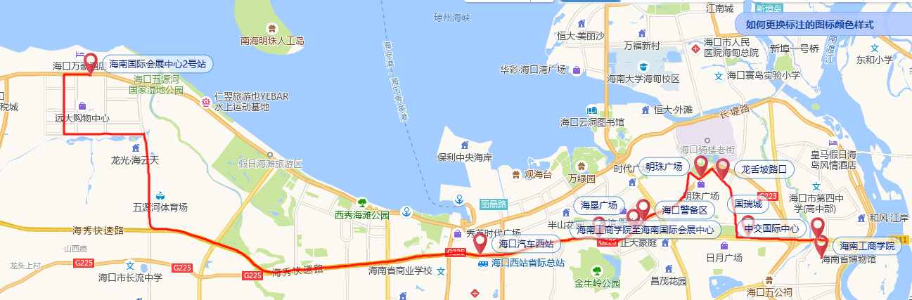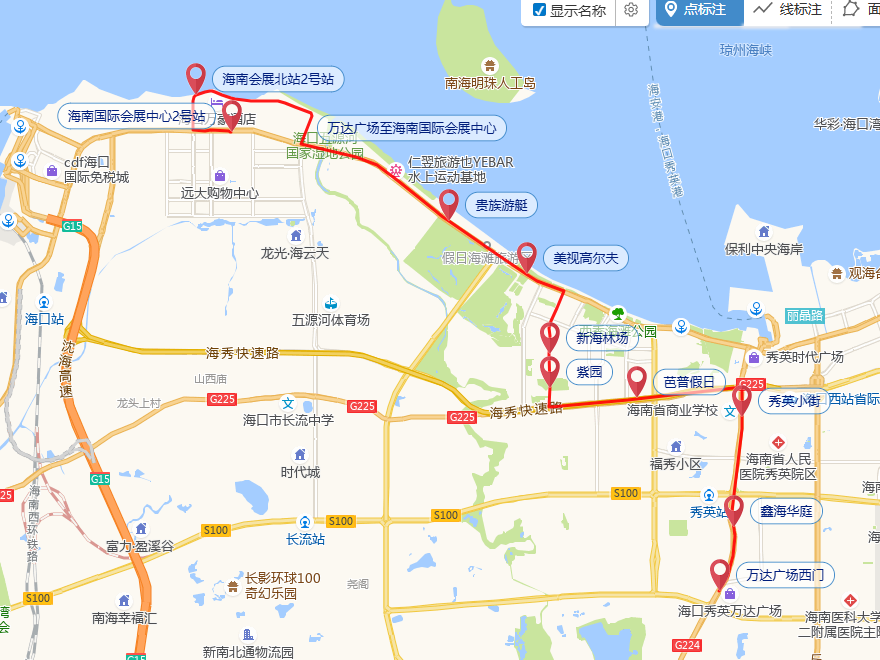 1、经停站点。往程,万达广场西门、鑫海华庭、秀英小街、芭普假日、紫园、新海林场、美视高尔夫、贵族游艇、海南会展北站2号站;返程,海南国际会展中心2号站(中间通道)、贵族游艇、美视高尔夫、新海林场、紫园、芭普假日、海玻市场、鑫海华庭、万达广场西门。