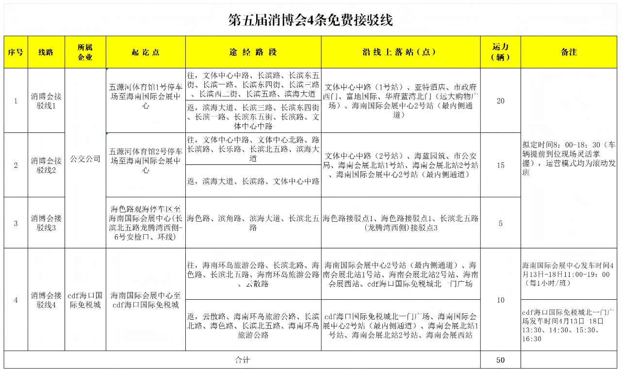 (四)消博会公交免费接驳线4,海南国际会展中心至cdf海口国际免税城,配备运力10辆(由cdf海口国际免税城提供车),经停站点5个。