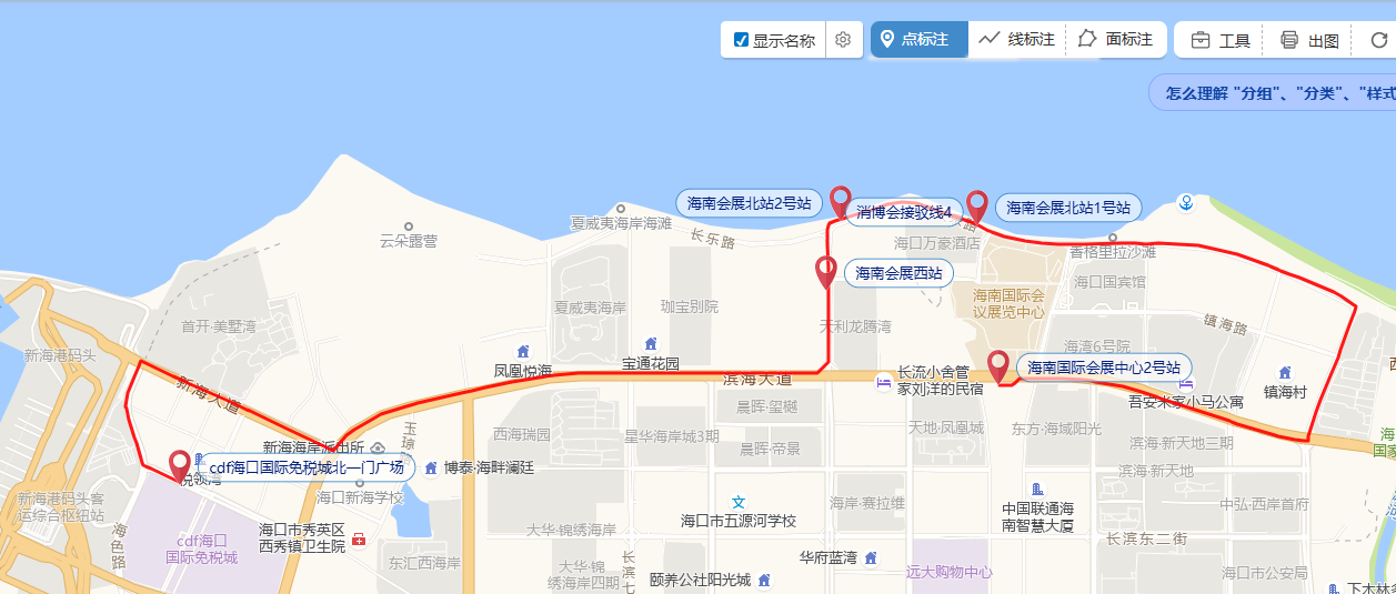 1、经停站点。海南国际会展中心2号站(最内侧通道)、海南会展北站1号站、海南会展北站2号站、海南会展西站、cdf海口国际免税城北一门广场。