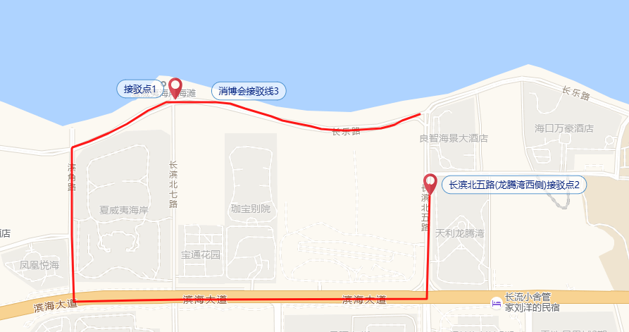 (三)消博会公交免费接驳线3,海色路观海停车区至海南国际会展中心(长滨北五路龙腾湾西侧-6号安检口、环线),配备公交运力5辆,经停站点3个。