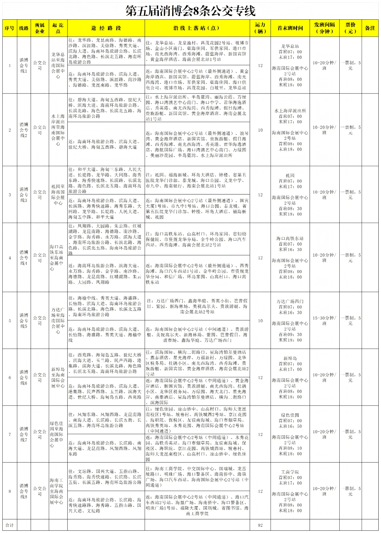(五)消博会专线5,万达广场至海南国际会展中心,配置公交车10辆,往返程共经停18个站点。