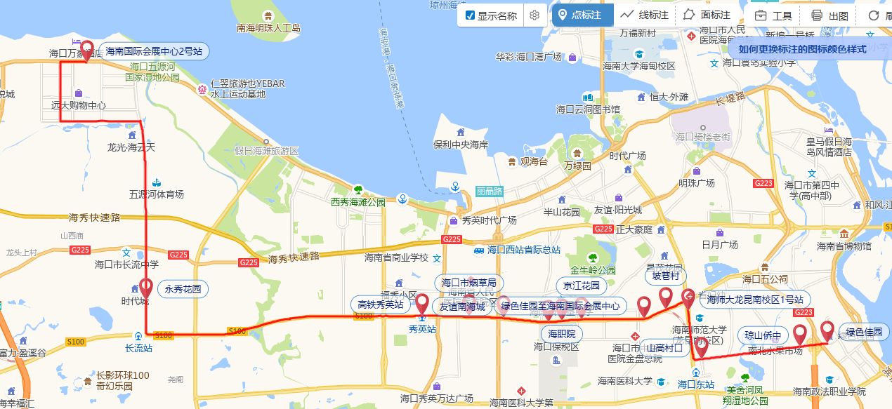 1、经停站点。往程,海口高铁东站、山高村口、环岛家园、省妇幼保健院、市资规局龙华分局、金牛岭公园、海口汽车西站、西秀海滩、海南会展北站2号站;返程,海南国际会展中心2号站(最外侧通道)、西秀海滩、海口汽车西站1号站、金牛岭公园、市资规局龙华分局、和信广场、环岛家园、山高村口、海口高铁东站。