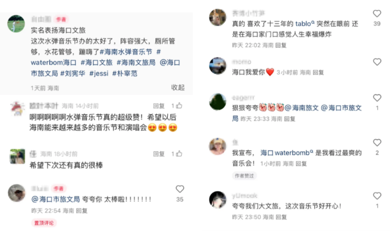 “现场嗨爆!体验感很好。海口是一座美丽的城市,令人着迷。”音乐风格多元、可玩性很高,光是海口本地的美食就值得来一趟了……无论在演出现场,还是在社交平台,WATERBOMB海南站音乐节所引发的“连锁反应”仍在持续升温,观众们慷慨地分享着他们对WATERBOMB海南站音乐节的热爱,以及在海口所收获的种种惊喜。