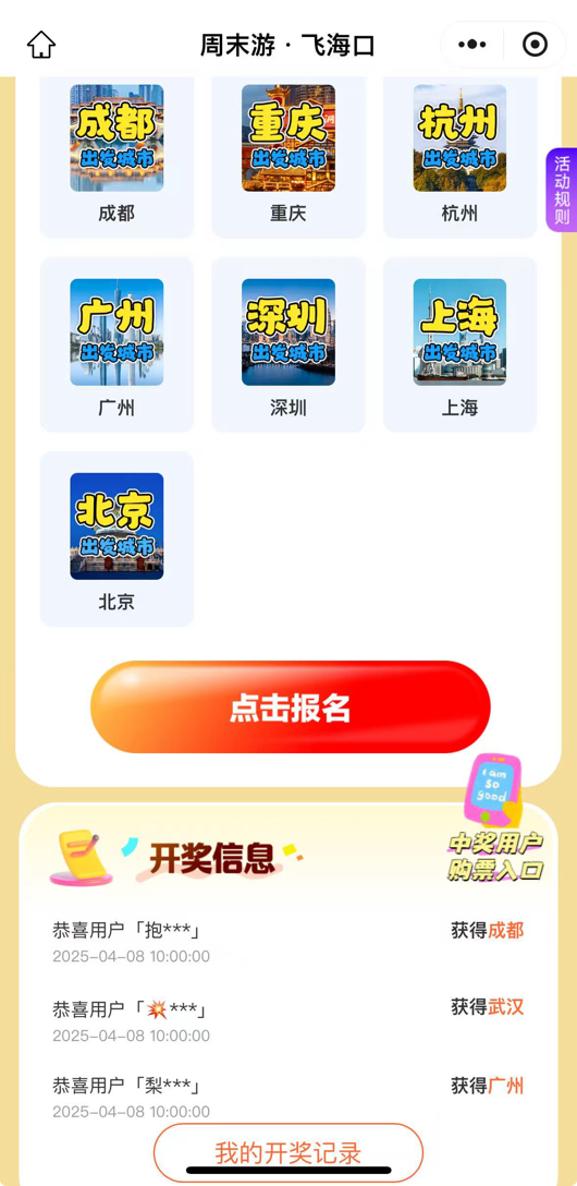 4月8日,在同程旅行小程序,“海口真好玩”——周末游飞海口”活动公布了首波“机票买一送一”抽奖活动中奖名单,来自成都、武汉、广州等10个城市的10名游客成为第一批幸运儿。4月11日开始,这10组游客就可以以超优惠的价格,体验椰风海韵、渔港烟火的“48小时岛民生活”。