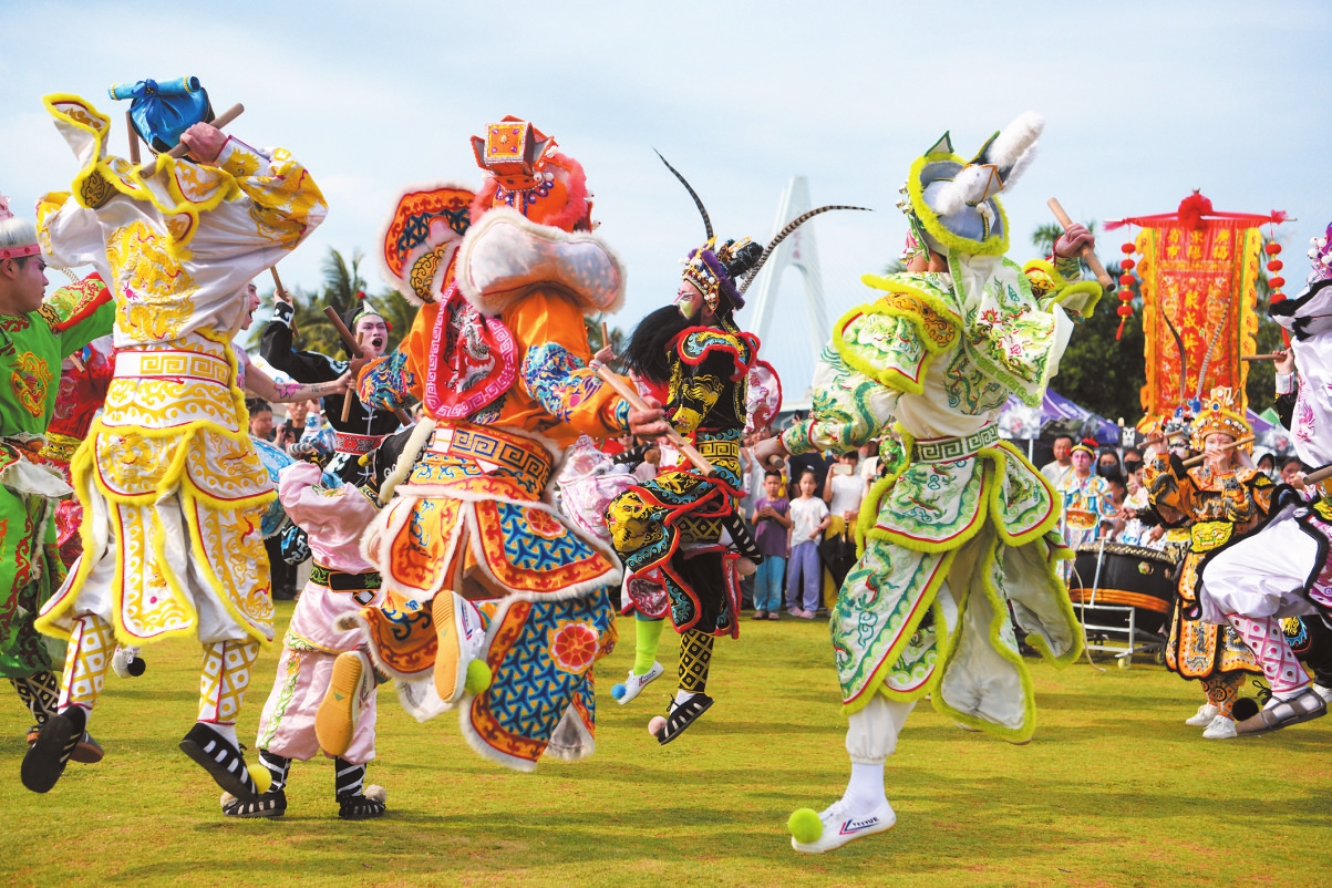 云洞图书馆前,英歌战舞铿锵的短槌声响起,传统非遗与现代艺术展开“对话”。舞者脸上的油彩随着数字投影变幻,古老战舞在先锋建筑的曲面墙上投下动感剪影。红树林栈道间,黎族《舂米舞》与湿地生态相映成趣,游客踩着竹竿舞的节奏,惊起白鹭掠过翡翠般的海面。夜幕降临后,海甸溪畔的微醺市集飘散着精酿啤酒的香气,机车快闪族与民谣歌手共享同一片星空,手作匠人的蓝染布匹在晚风中舒展,勾勒出海岛夜生活的迷人画卷。